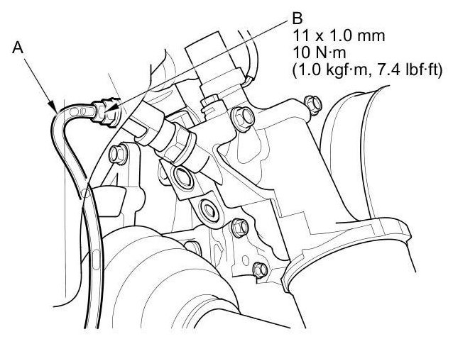 4. Install a rubber hose (A) on the drain bolt (B) located at the rear of the engine block, then loosen the drain bolt.