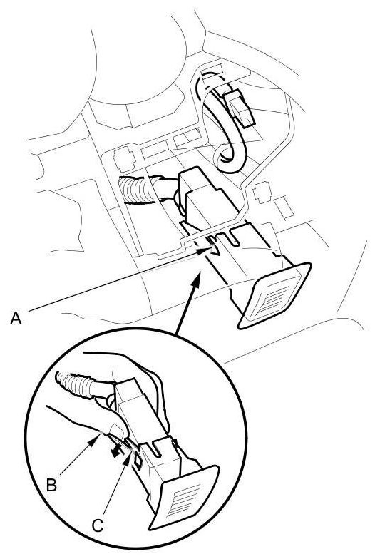 4. Unhook the left lock tab (A) of the humidity/in-car temperature sensor by pushing your thumb (B) between the sensor and tab (C).