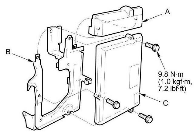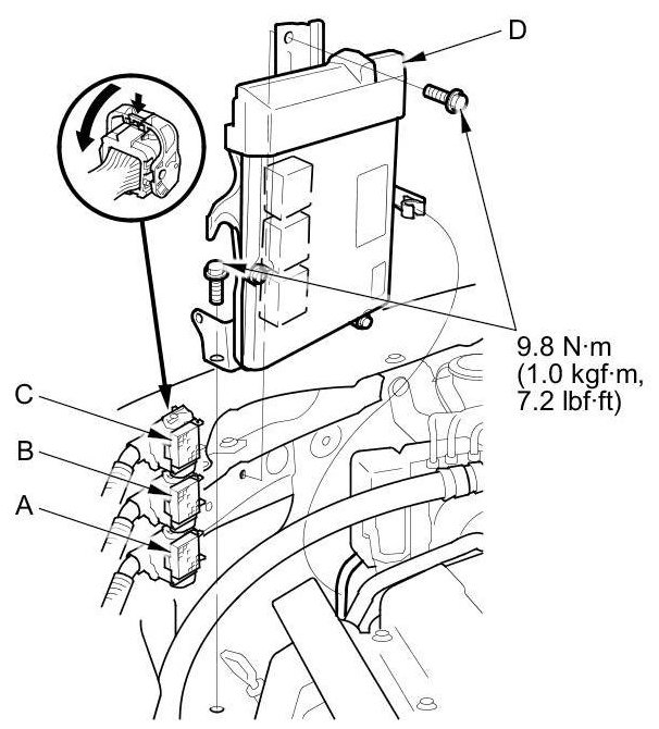 12. Disconnect ECM/PCM connectors A, B, and C, then remove the ECM/PCM assembly (D).