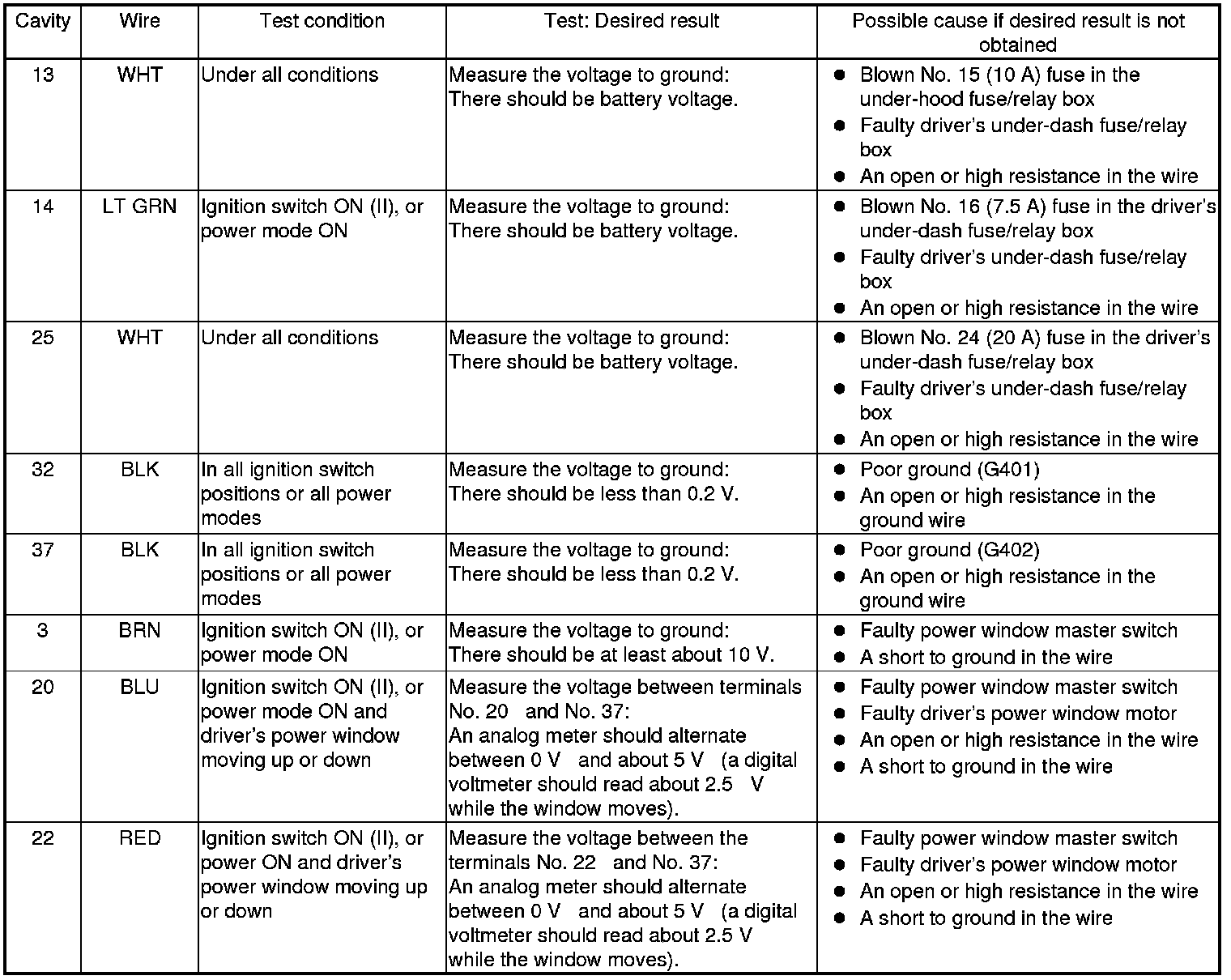 6. With the power window master switch 37P connector still disconnected from the power window master switch, do the following input tests: