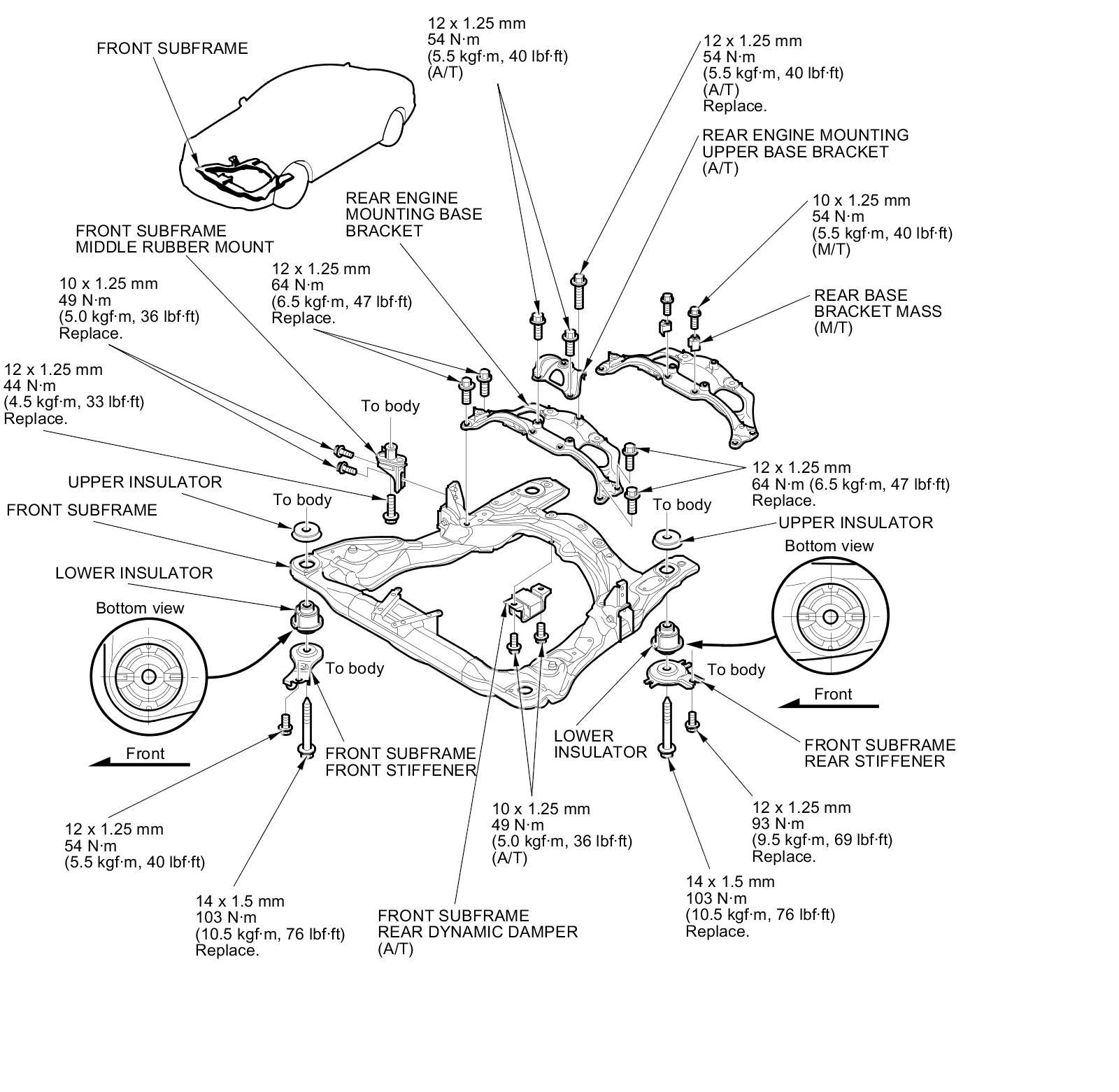 After removing the front subframe mounting bolts, the front subframe middle rubber mount mounting bolts, the front subframe rear stiffener mounting bolts, the rear engine mounting base bracket mounting bolts, and the rear engine mounting upper base bracket mounting bolt, be sure to replace them with new ones.