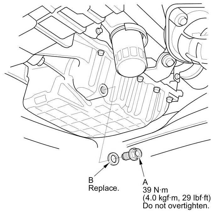 4. Reinstall the drain bolt with a new washer (B) and torque to specification.