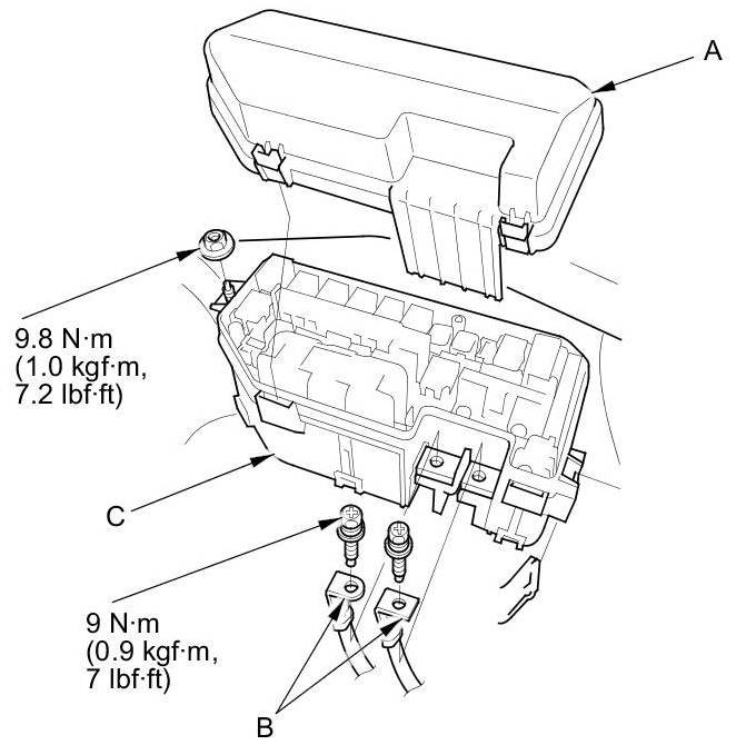 3. Remove the under-hood fuse/relay box (C) from the bracket.