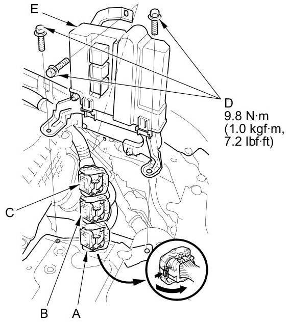 11. Disconnect PCM connectors A, B, and C, then remove the PCM assembly (E).