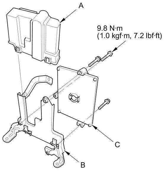 12. Remove the cover (A) and the bracket (B) from the PCM (C).