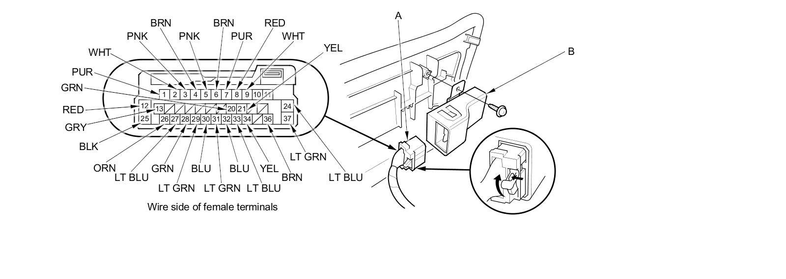 2. Disconnect the 37P connector (A) from the seat ventilation control unit (B).