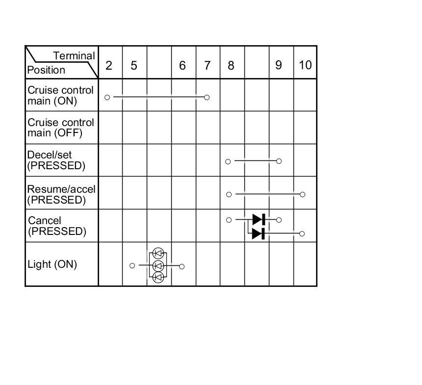 - If there is continuity, and it matches the table, but the cruise control combination switch failure occurred on the cruise control input test, check and repair the wire harness on the switch circuit.