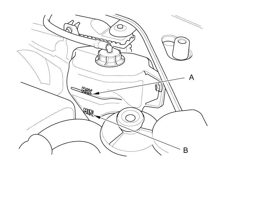 1. Check the coolant level in the coolant reservoir. Make sure it is between the MAX mark (A) and the MIN mark (B).