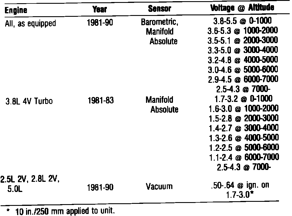 Manifold Absolute Pressure Sensors: Measure voltage with ignition on and engine off. Start engine and apply 10 in./250 mm Hg to unit, voltage should be: 3.8L Turbo 4V, 0.9-1.7 volts less; others, 1.2-2.3 volts less.