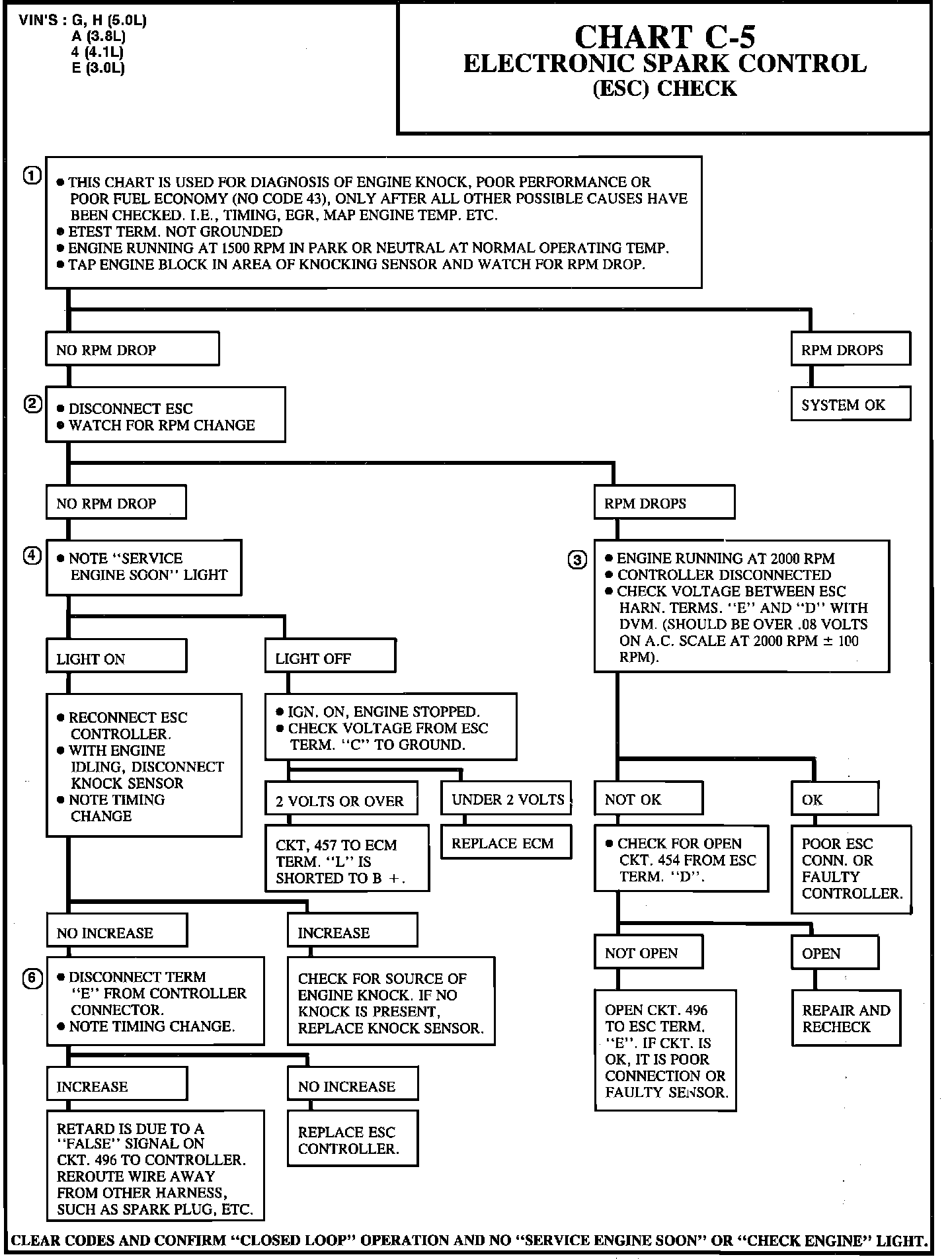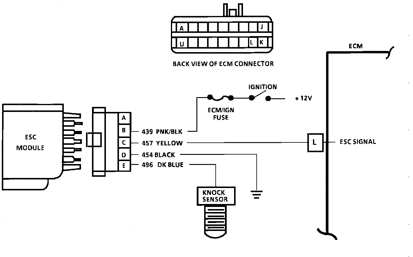 4. "Service Engine Soon" light should be "ON" and a Code 43 set because ESC system would be retarded too long. If no light comes on, the ECM is not retarding the spark because of a voltage on CKT .457 to terminal "L" or the ECM is faulty.