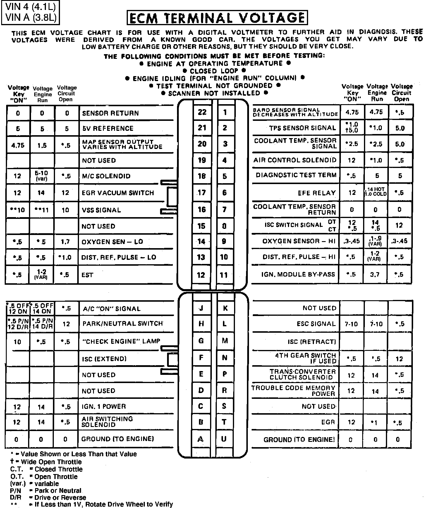 Fig. 001 - ECM Connector Terminal Identification & Voltage Specifications.: