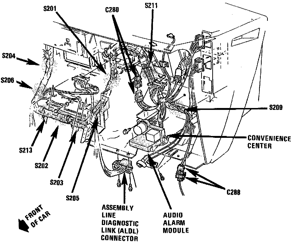 The Audio Alarm Module is located in the Convenience Center. The Convenience Center is located behind I/P, left of steering column.