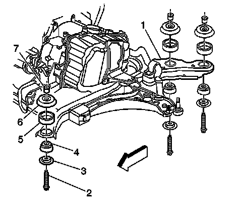 4. Install the engine frame insulator fasteners (3) to retain the engine frame (2) to the vehicle.