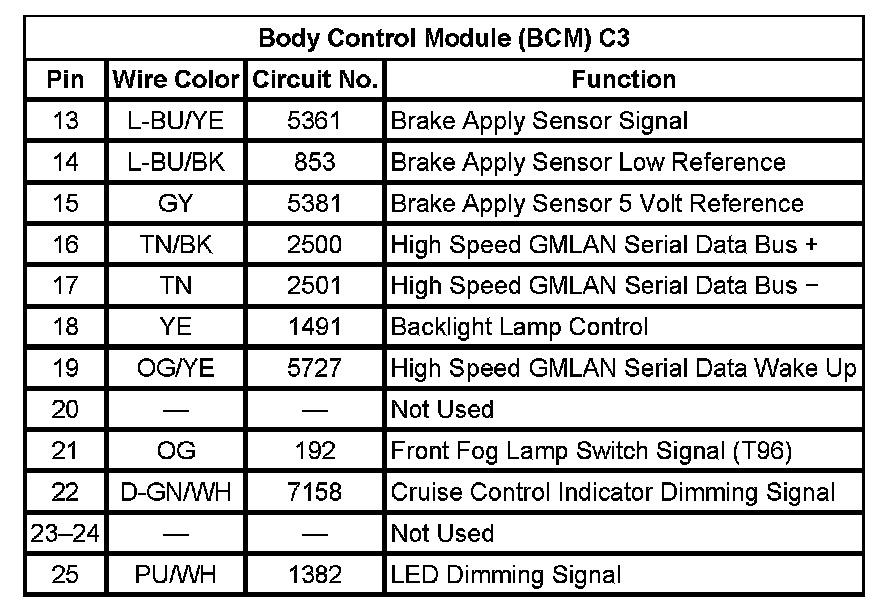 Body Control Module (BCM) C3 (Pin 13 - Pin 25):