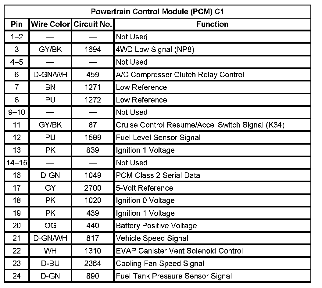 Powertrain Control Module (PCM) C1 (Pin 1 To 24):