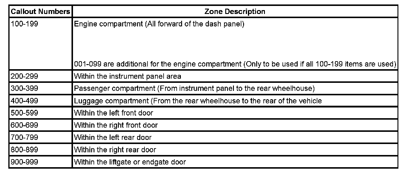 All grounds, in-line connectors, pass-through grommets, and splices have identifying numbers that correspond to where they are located in the vehicle. The table explains the numbering system.