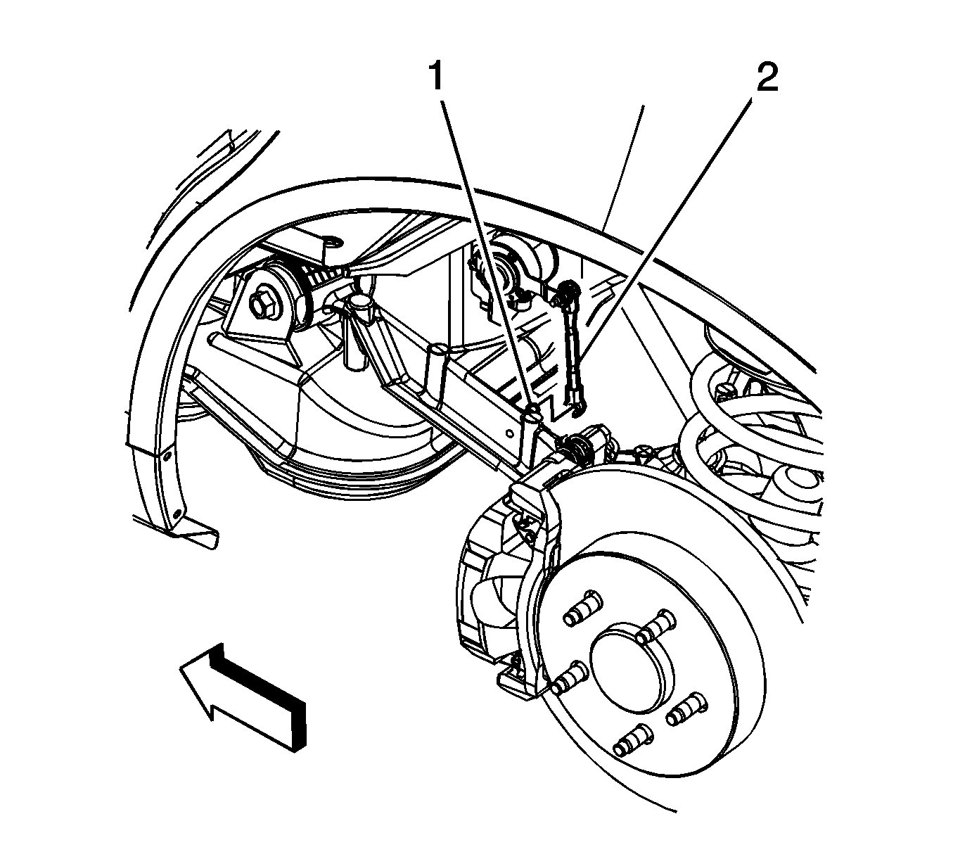 6.Remove the electronic level control link (2) from the ball stud (1) on the lower control arm.