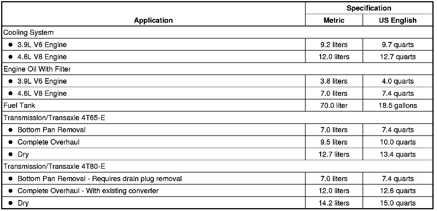 The following approximate capacities are given in US English and metric conversions. See Fluid and Lubricant Recommendations (Maintenance) for more information. All capacities are approximate. When adding, be sure to fill to the approximate level, as recommended in this manual. Recheck fluid level after filling.