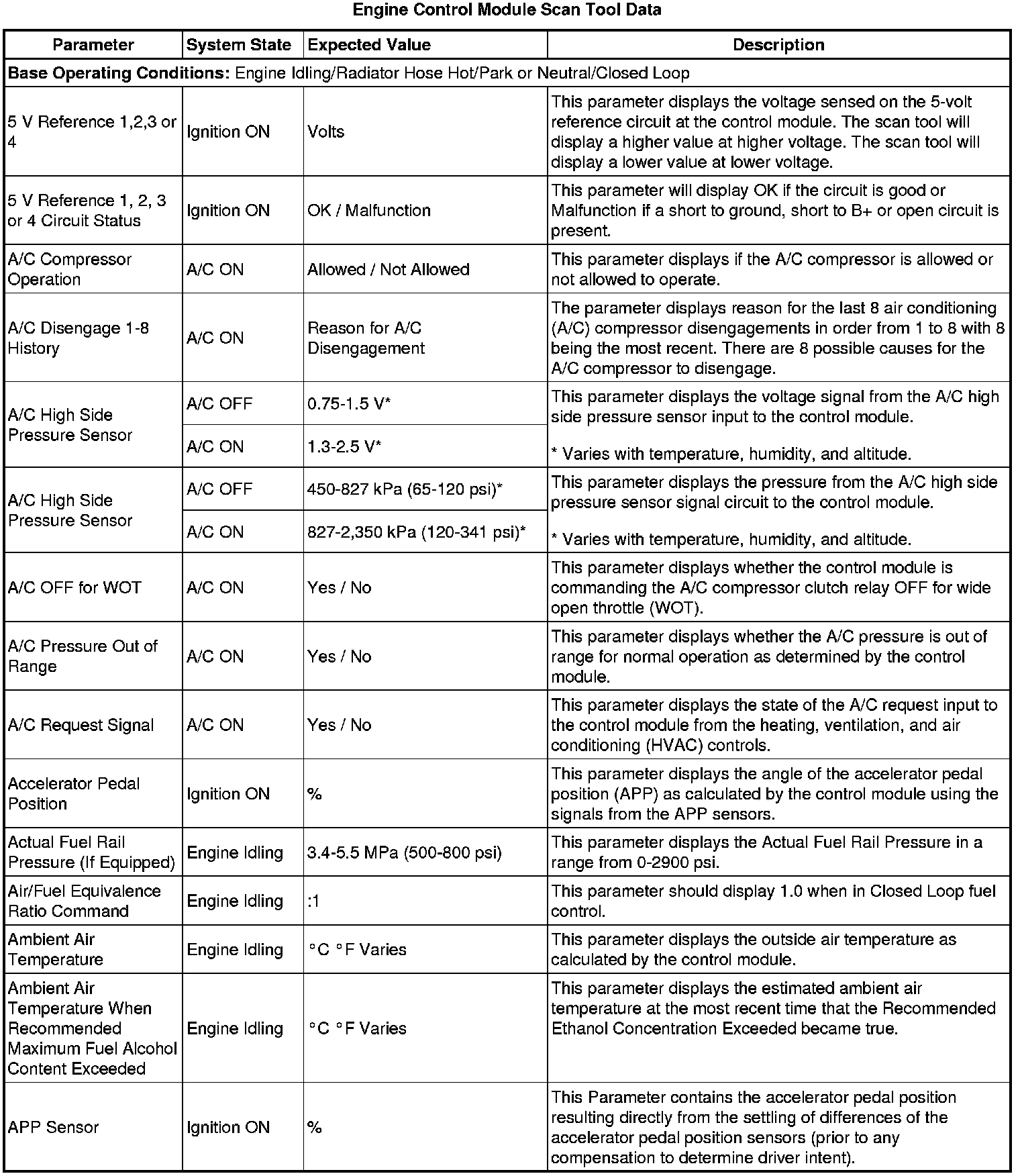 The Engine Control Module Scan Tool Data List contains all engine-related parameters that are available on the scan tool. The list is arranged in alphabetical order. A given parameter may appear in any one of the data lists, and in some cases may appear more than once, or in more than one data list in order to group certain related parameters together.