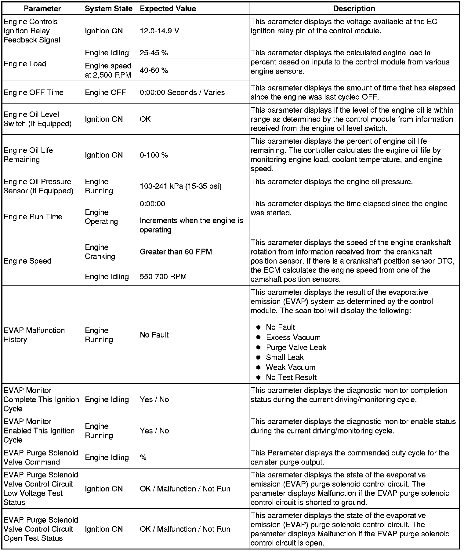 The scan tool values from a properly running engine may be used for comparison with the engine you are diagnosing. The Engine Scan Tool Data List represents values that would be seen on a normally running engine.
