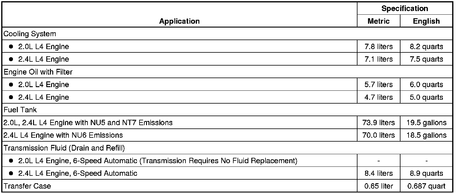 The following approximate capacities are given in US English and metric conversions. See Fluid and Lubricant Recommendations (Maintenance) for more information. All capacities are approximate. When adding, be sure to fill to the approximate level as recommended in this manual. Recheck fluid level after filling.