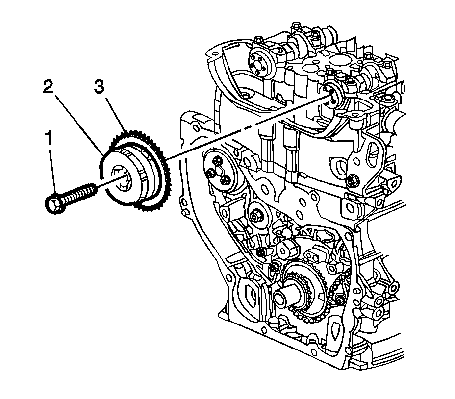 9. Remove the exhaust camshaft actuator (1, 3) from the camshaft and timing chain.