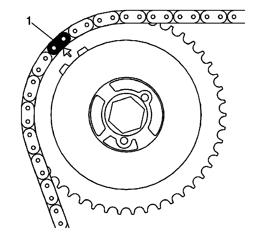 9. Route the timing chain around the crankshaft sprocket and line up the first matching colored (1) link with the timing mark on the crankshaft sprocket, in approximately the 5 o'clock position.