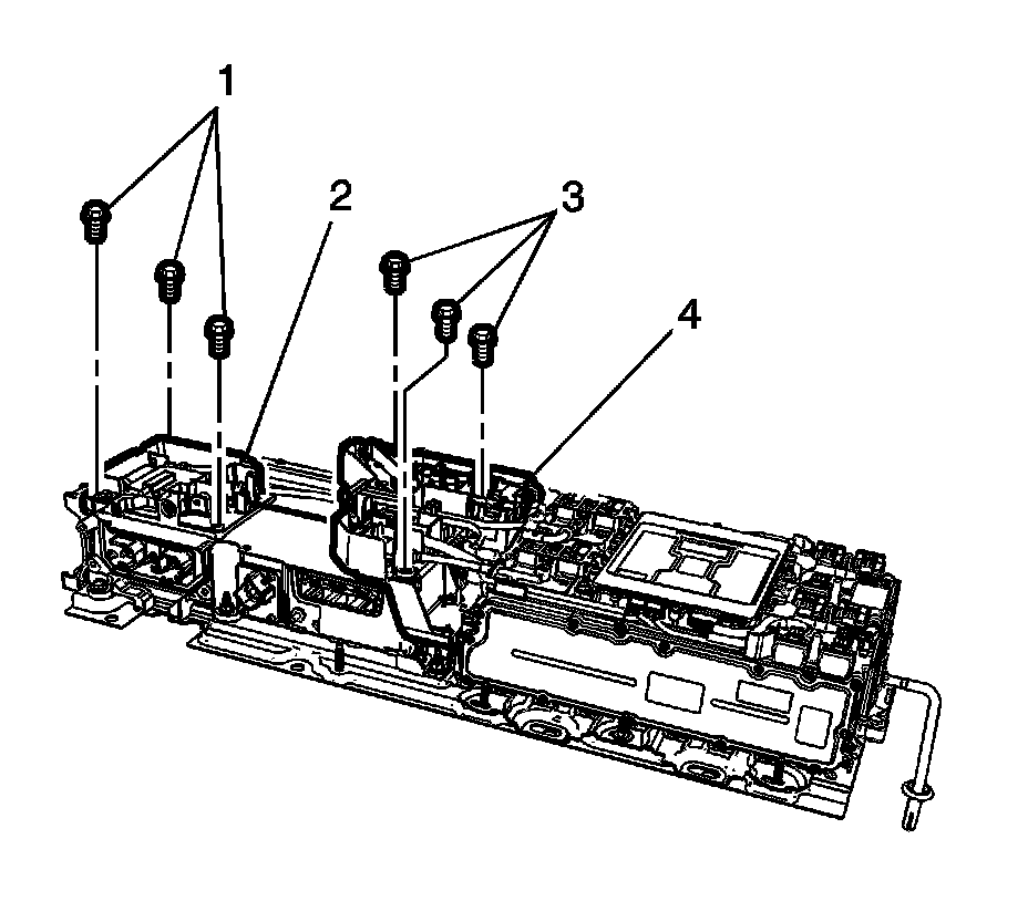 4. Remove the fasteners (3) securing the battery energy control module wiring junction block (4), to the top of the generator control module.