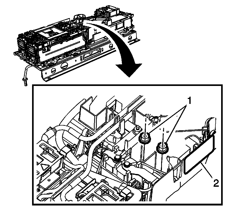 7. Install the battery energy control module wiring junction block fasteners (2) and tighten to 9 Nm (80 lb in).