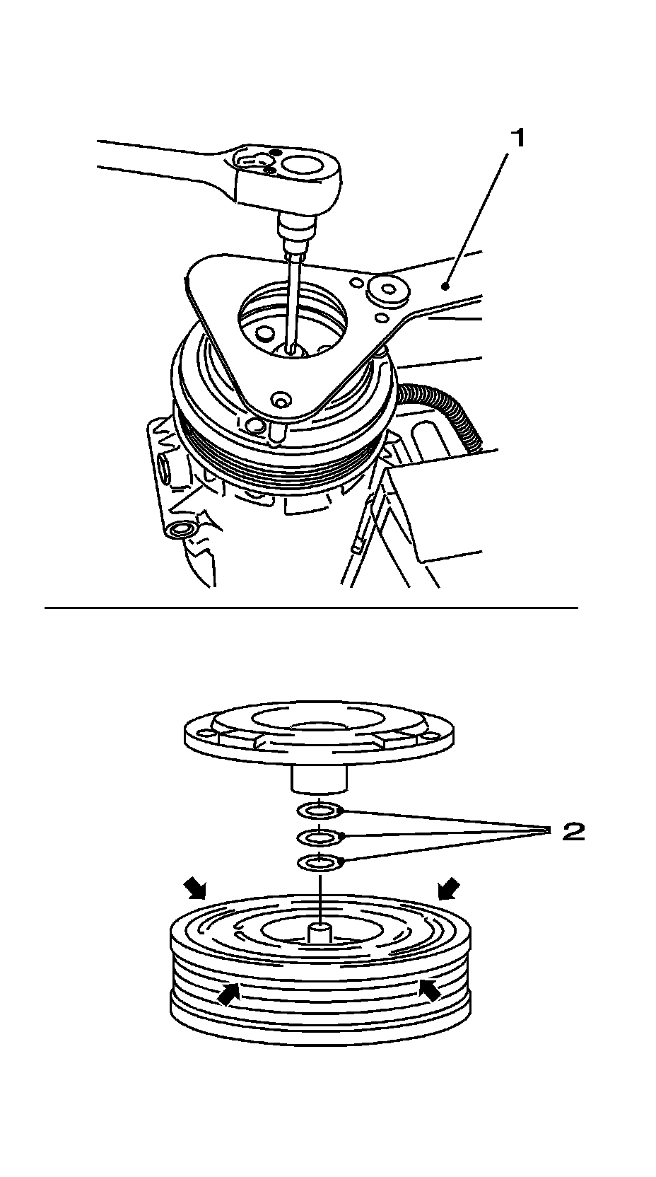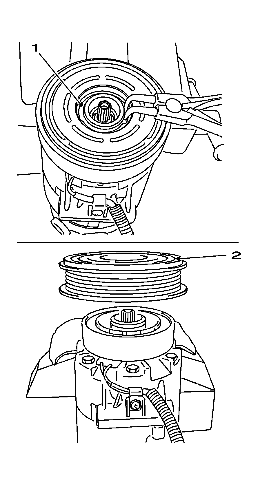 6. Pull off the compressor pulley (2).