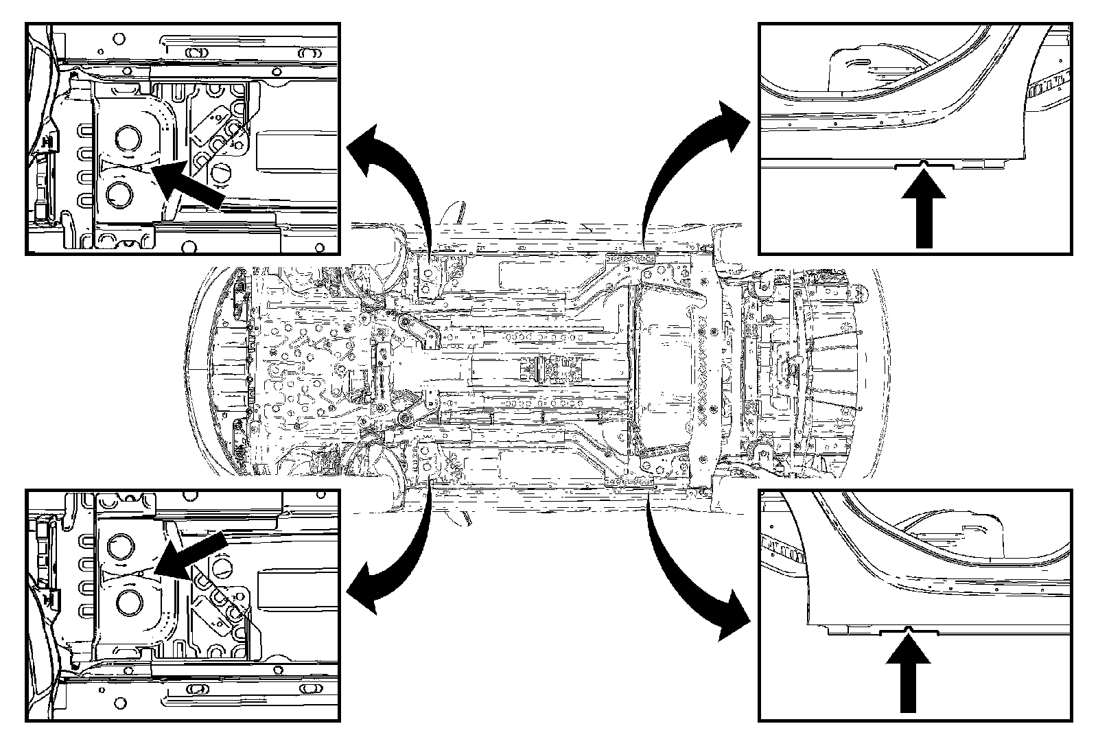 * Perform the vehicle lifting or jacking procedure only at the identified lift points. DO NOT allow the lifting equipment or jacking equipment to contact any other vehicle components.
