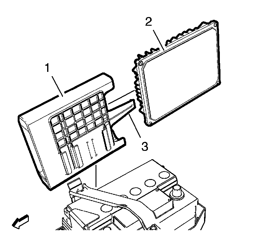 4. Remove the ECM bracket (1) along with the ECM (2) from the battery tray.