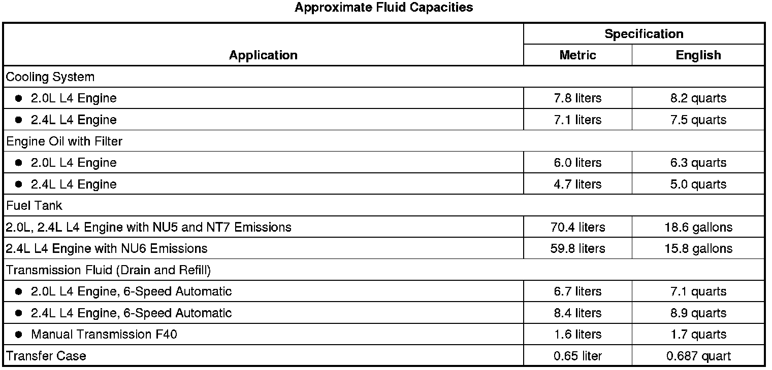 The following approximate capacities are given in US English and metric conversions. See Fluid and Lubricant Recommendations Maintenance for more information. All capacities are approximate. When adding, be sure to fill to the approximate level as recommended in this manual. Recheck fluid level after filling.