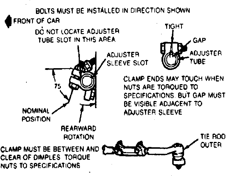 3. After completing adjustment, check to ensure that the number of threads at each end of sleeve are equal and tie rod end housings and clamps are properly positioned, Fig. 3. Torque clamp bolt to 14 to 15 ft. lbs.