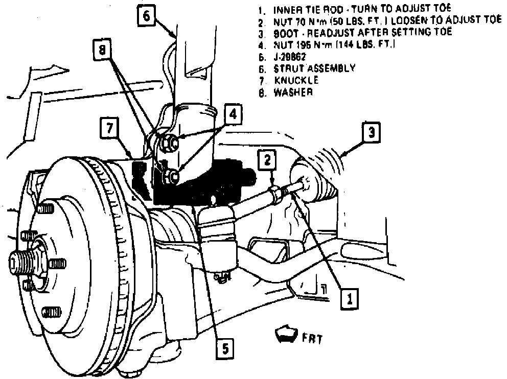 4. Remove adjusting tool and torque strut to knuckle attaching nuts to 144 ft. lbs.