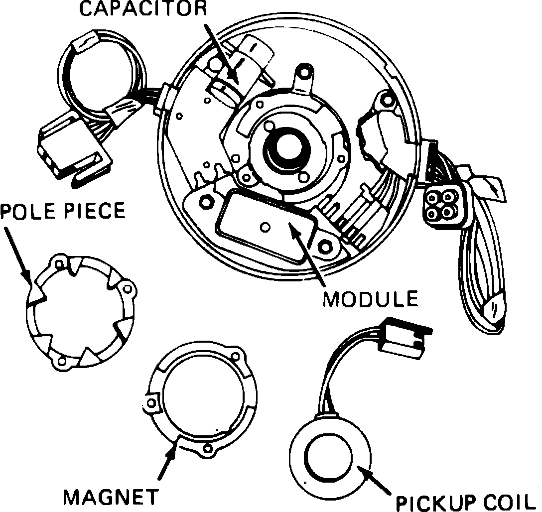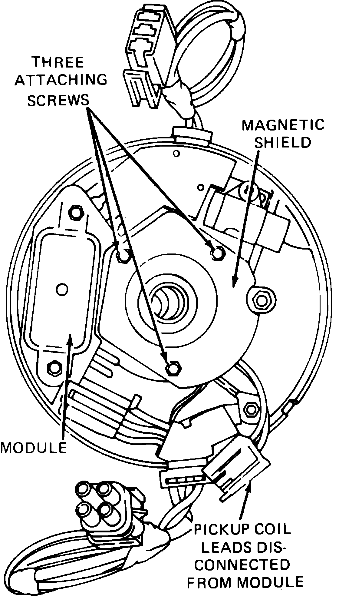 8. Remove module retaining screws and capacitor screw, then remove module, capacitor and harness assembly from distributor.