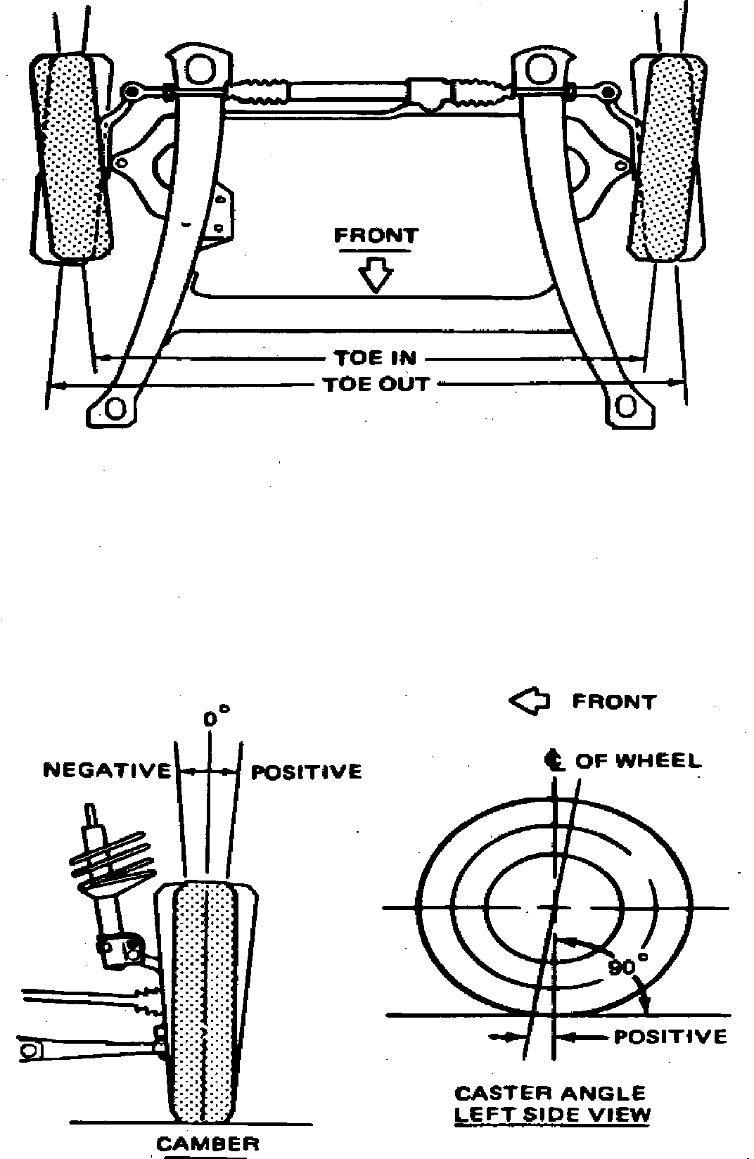 Install alignment equipment following equipment manufacturer's instructions. Measure alignment angles, Fig. 1, and record the readings. If adjustments are necessary, they must be made in order; caster first, camber second and toe third. Jounce front and rear bumpers 3 times to normalize suspension prior to measuring angles.