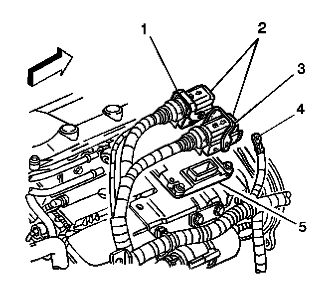 3. Flip the release levers to the open position (3) and disconnect the ECM connectors (2) from the ECM (5).