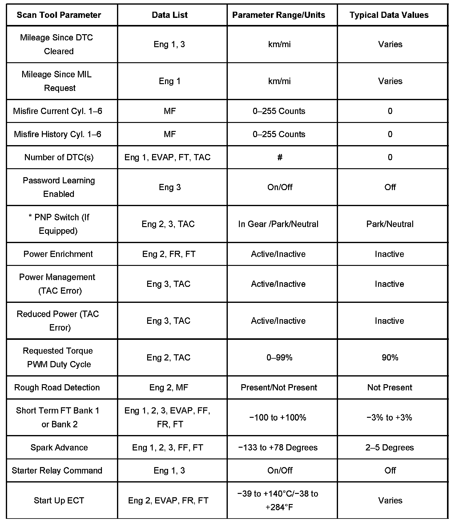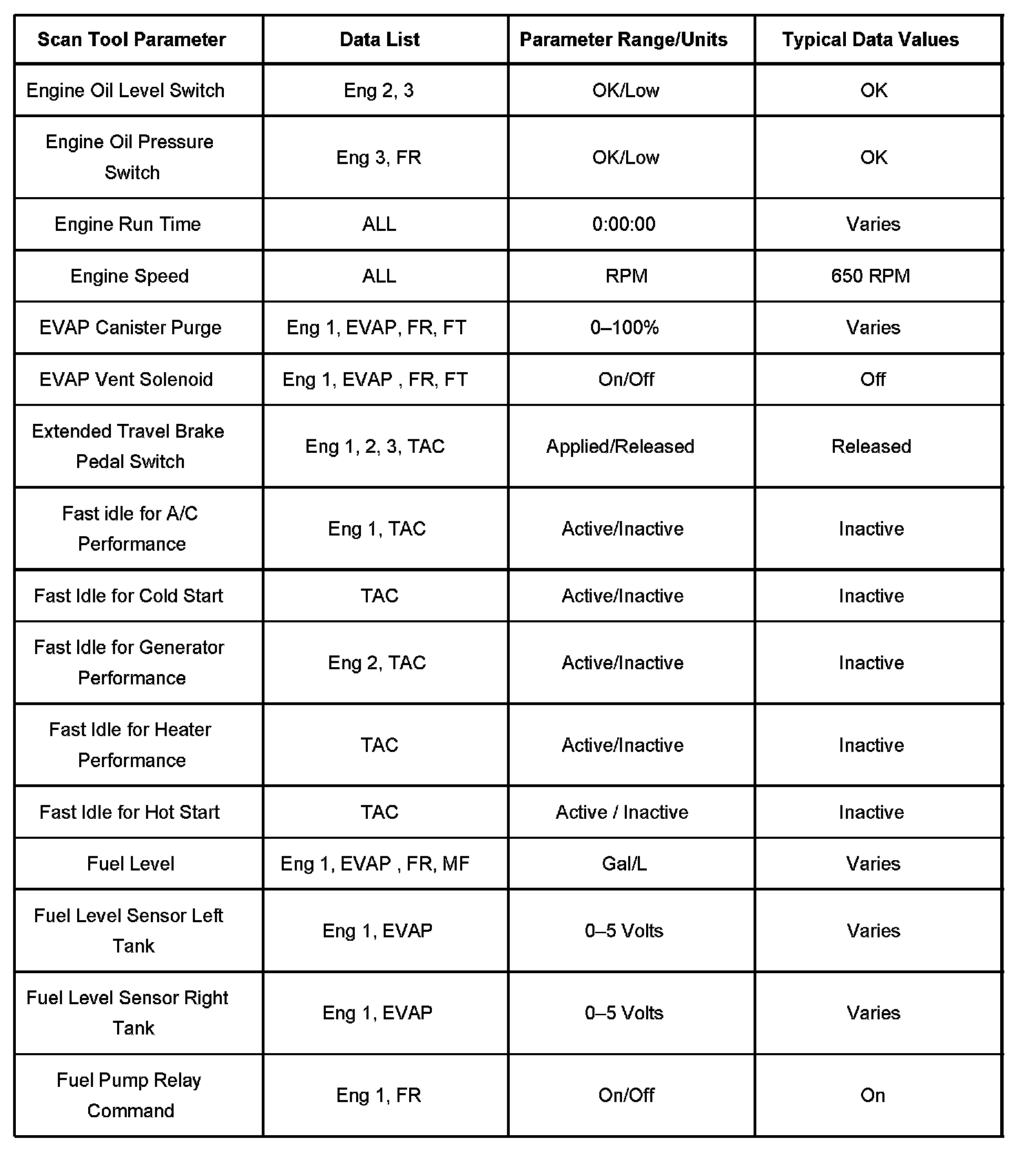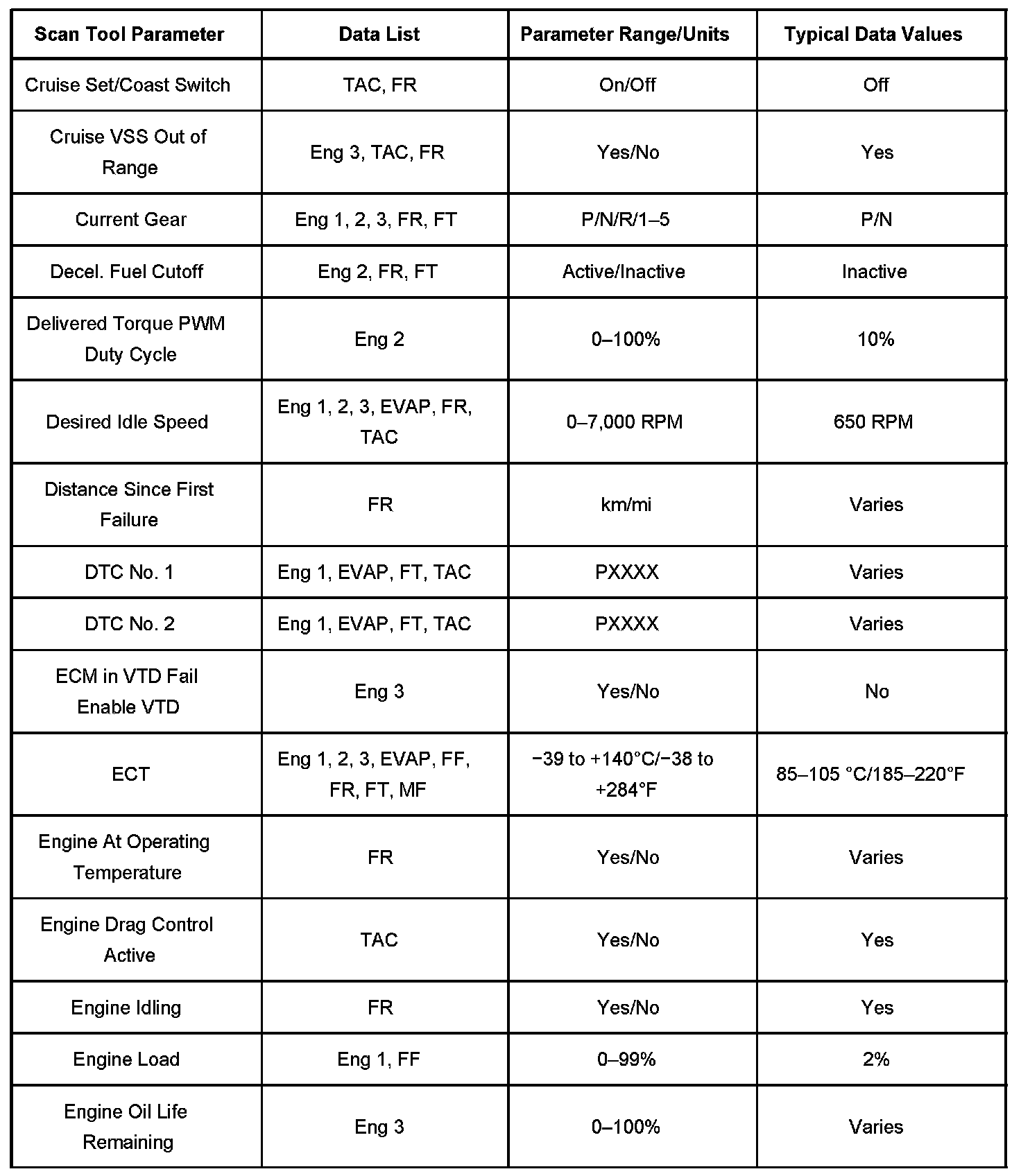 The Engine Scan Tool Data List contains all engine related parameters that are available on the scan tool. The list is arranged in alphabetical order. A parameter may appear in any one of the data lists, and in some cases may appear more than once, or in more than one data list in order to group certain related parameters together.