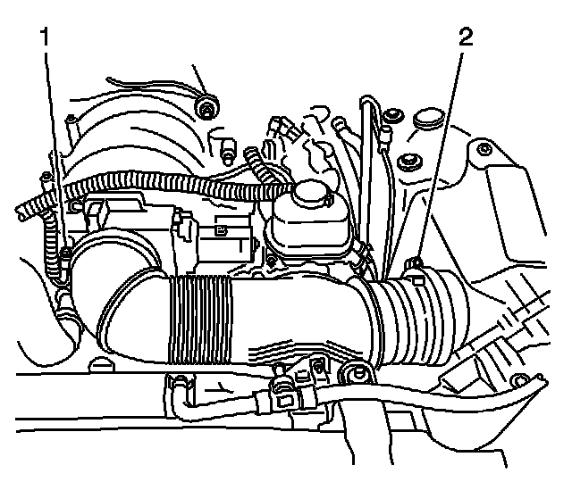 2. Loosen the air cleaner outlet duct clamps (1, 2).