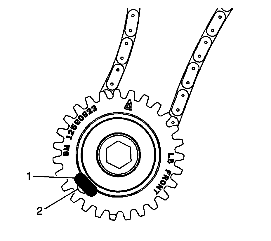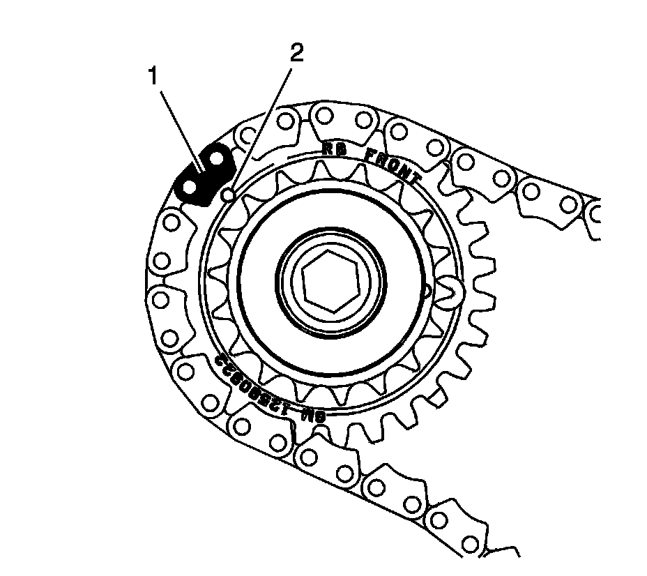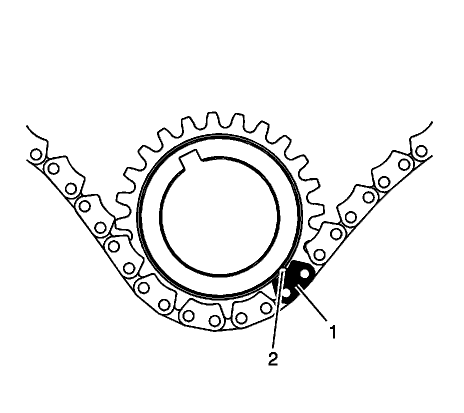 5. The crankshaft sprocket timing mark (2) will align with a timing camshaft drive chain link (1).