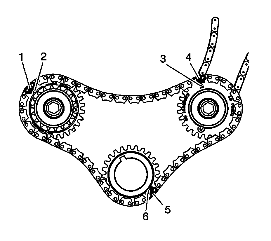 6. Ensure all the timing marks (2, 3, 6) are properly aligned with the timing camshaft drive chain links (1, 4, 5).