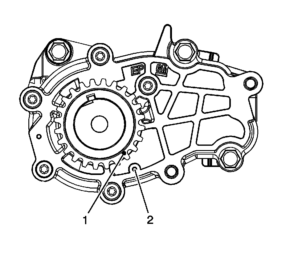3. Ensure the crankshaft is in the stage one timing position with the crankshaft sprocket timing mark (1) aligned to the stage one timing mark on the oil pump cover (2) using the EN 46111. Refer to Camshaft Timing Drive Chain Alignment Diagram (Second Design) - Stage One.