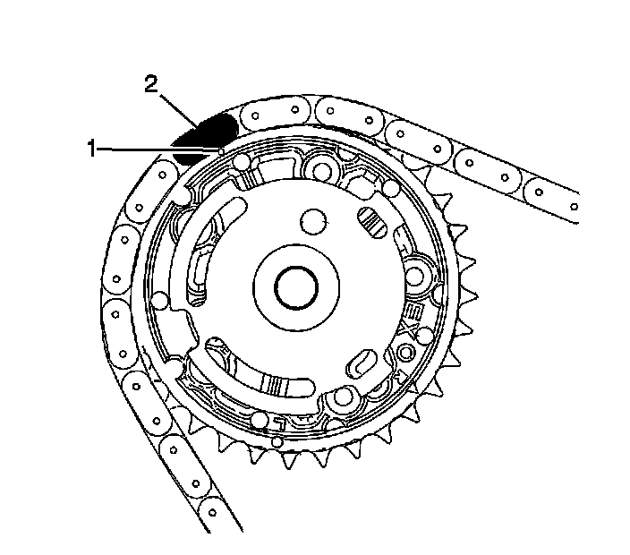 3. The left camshaft intermediate drive chain idler timing mark (1) will align with a timing camshaft drive chain link (2).