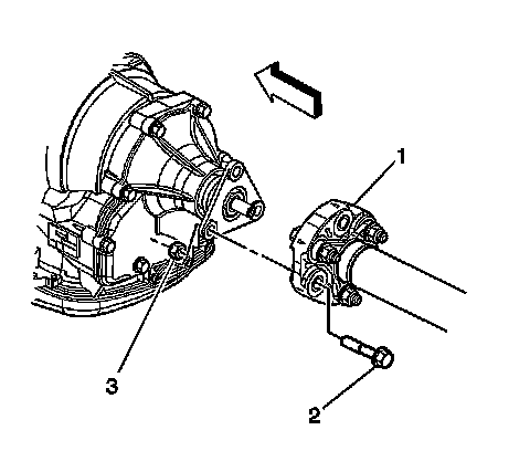 6. Push the front propeller shaft toward the rear of the vehicle in order to release the propeller shaft coupler (1) from the transmission flange.