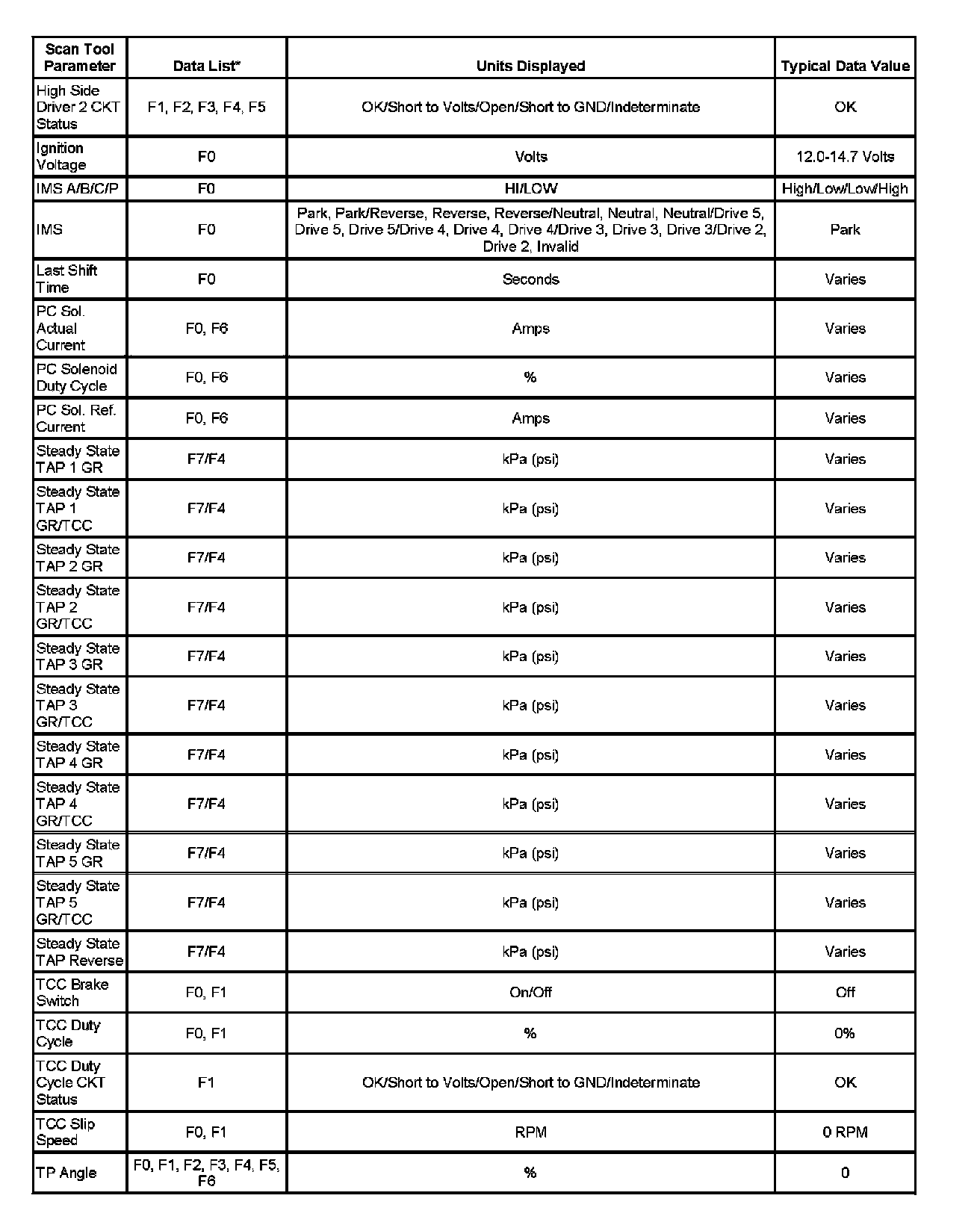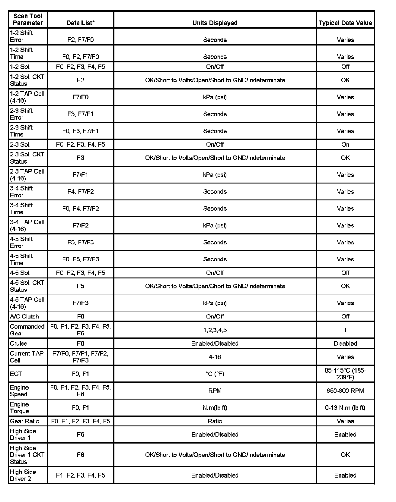 Only the parameters listed below are used in this service manual for diagnosing. If a scan tool displays other parameters, the values are not recommended by General Motors for use in diagnosis.