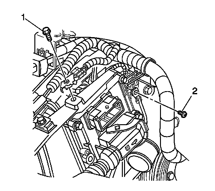 11. Remove the ECM redundant ground wire bolt (2) and wire from the ECM.