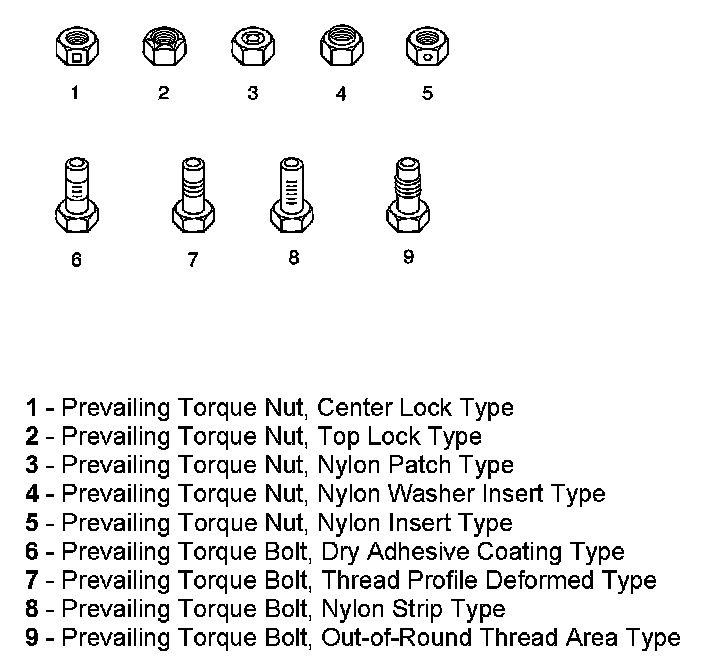 These fasteners accomplish the thread interface by the presence of a thread-locking compound on the fastener threads. Refer to the appropriate repair procedure in order to determine if the fastener may be reused and the applicable thread-locking compound to apply to the fastener.