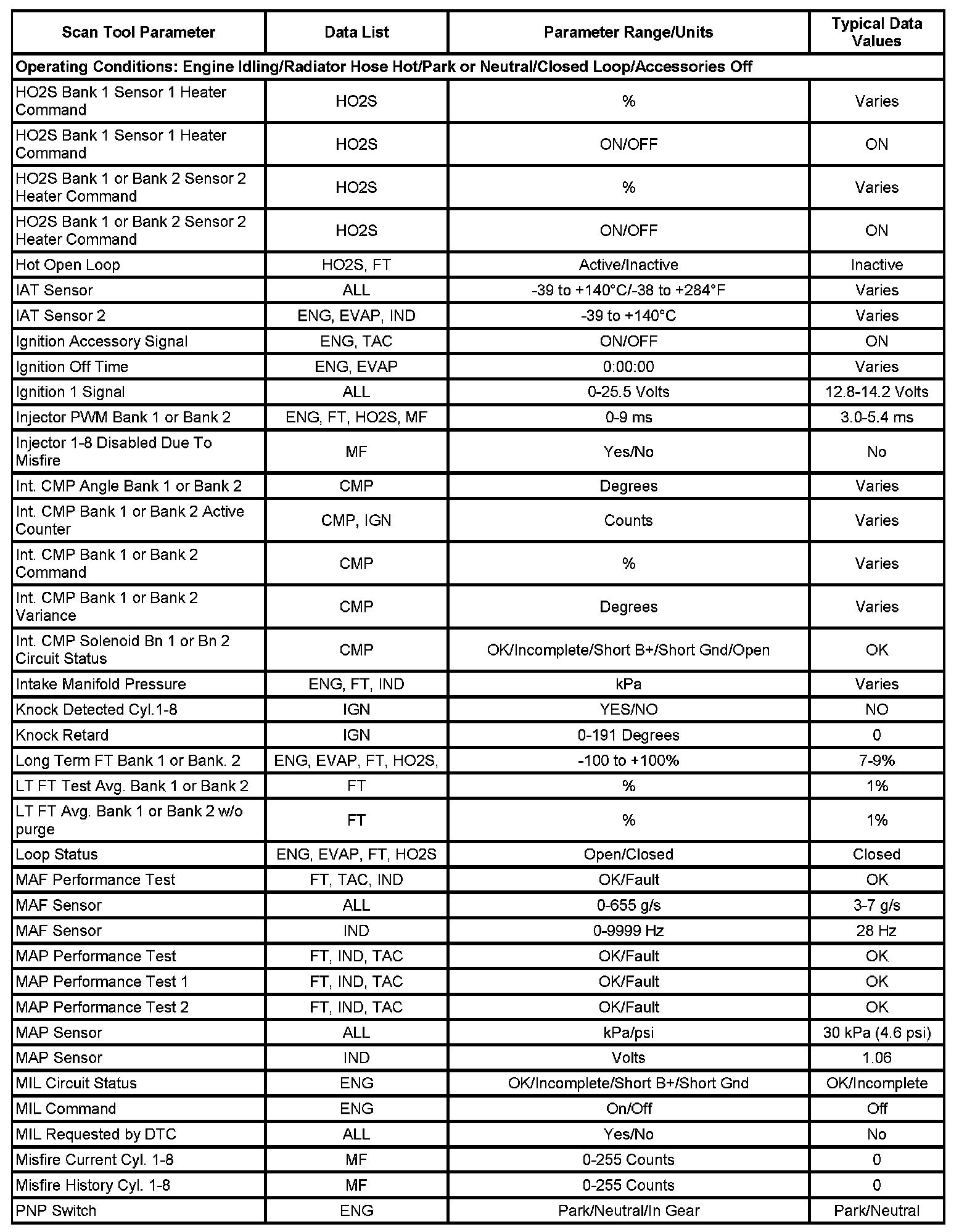 Scan tool values from a properly running engine may be used for comparison with the engine you are diagnosing. The Engine Scan Tool Data List represents the values that would be seen on a normal running engine.