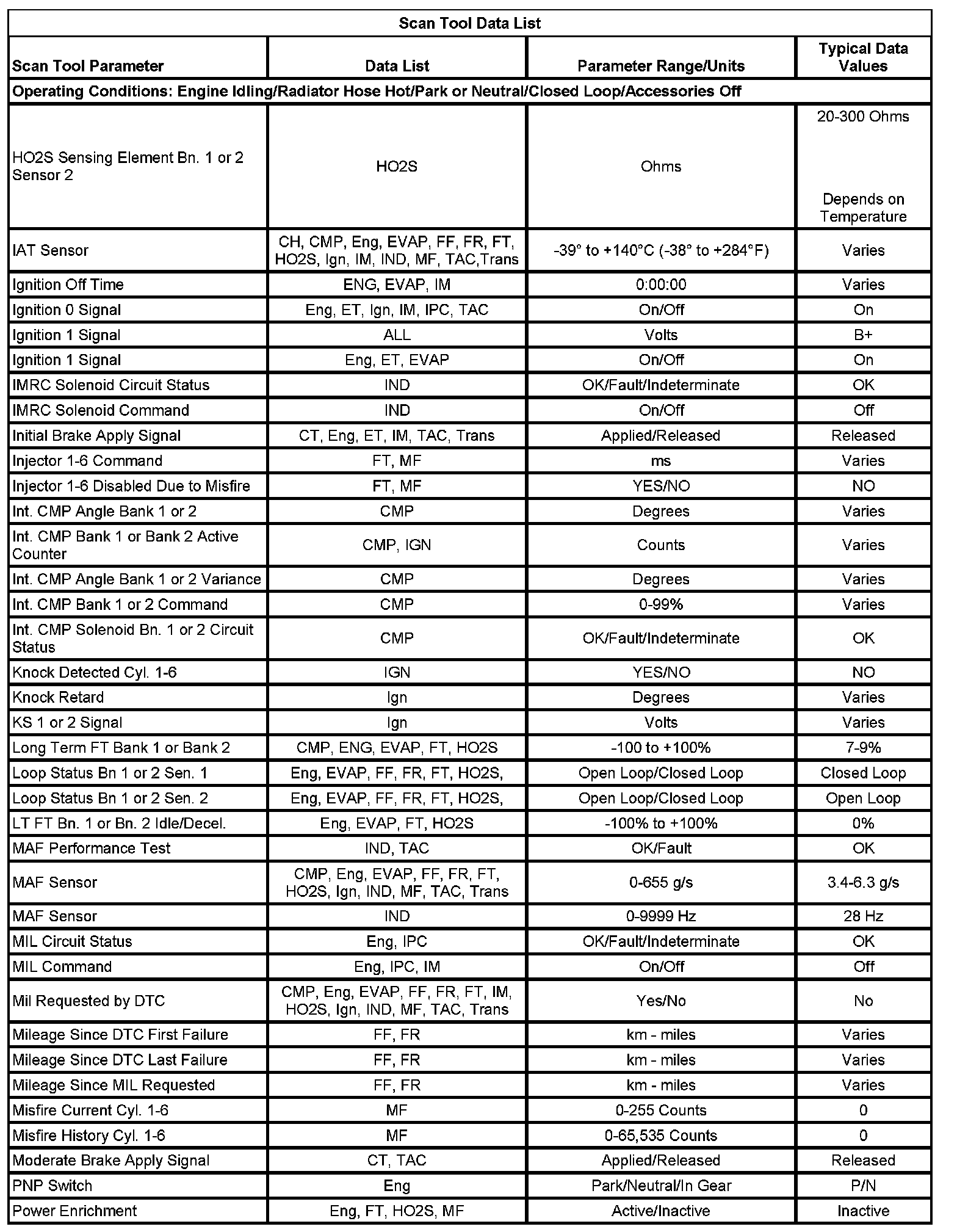 The column labeled Data List indicates where a parameter is located on the scan tool. Review the scan tool operating manual for the exact locations of the data lists. The following is a description of each term listed: